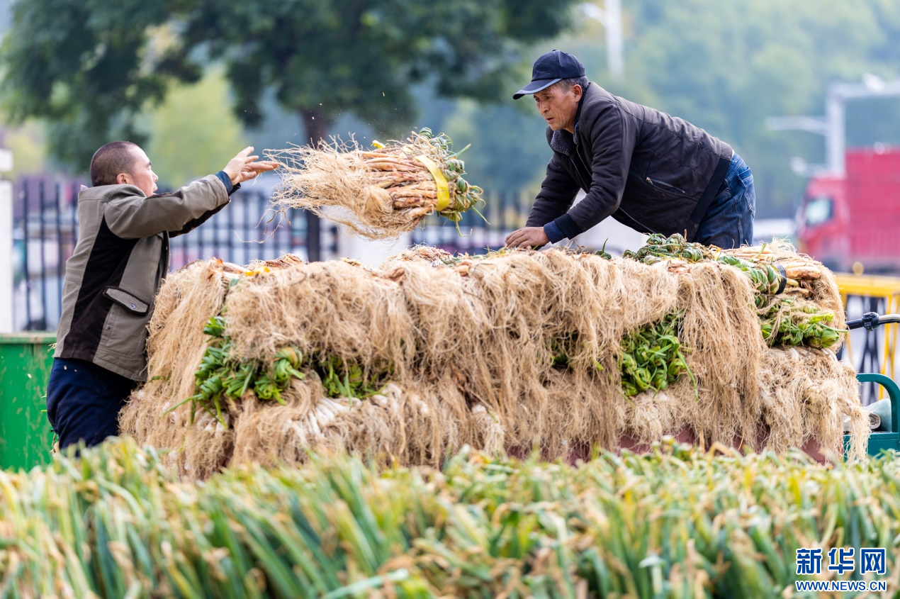 10月12日,呼和浩特市玉泉区美通农产品批发市场,商户在码放冬储大葱。新华网发(丁根厚 摄)