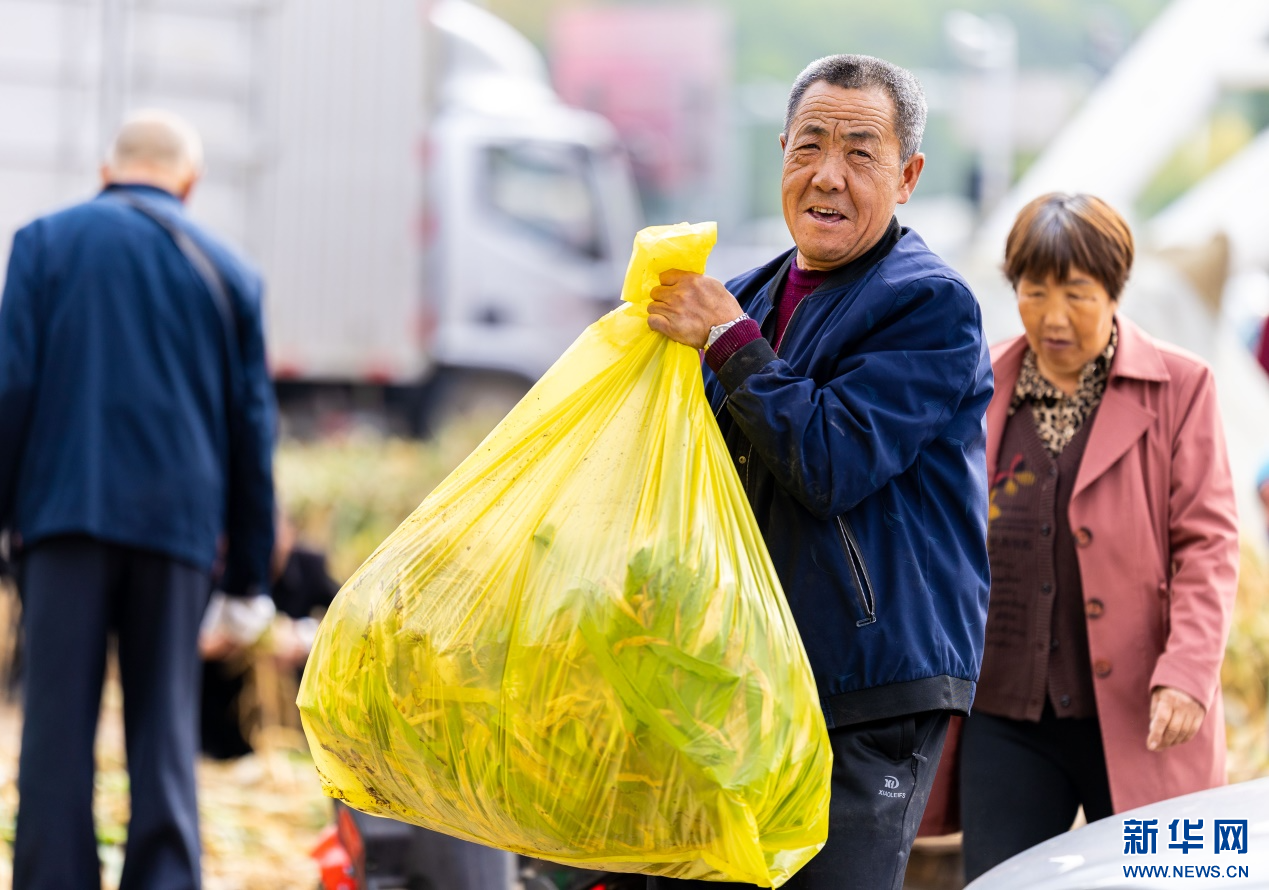 10月12日,呼和浩特市玉泉区美通农产品批发市场,市民准备将购买的冬储大葱运回家。新华网发(丁根厚 摄)