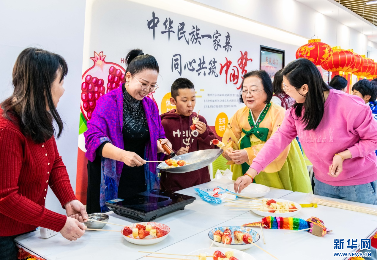 2月23日,社区志愿者与居民在呼和浩特市玉泉区清泉街社区喜迎元宵节活动现场制作糖葫芦。新华网发(丁根厚 摄)