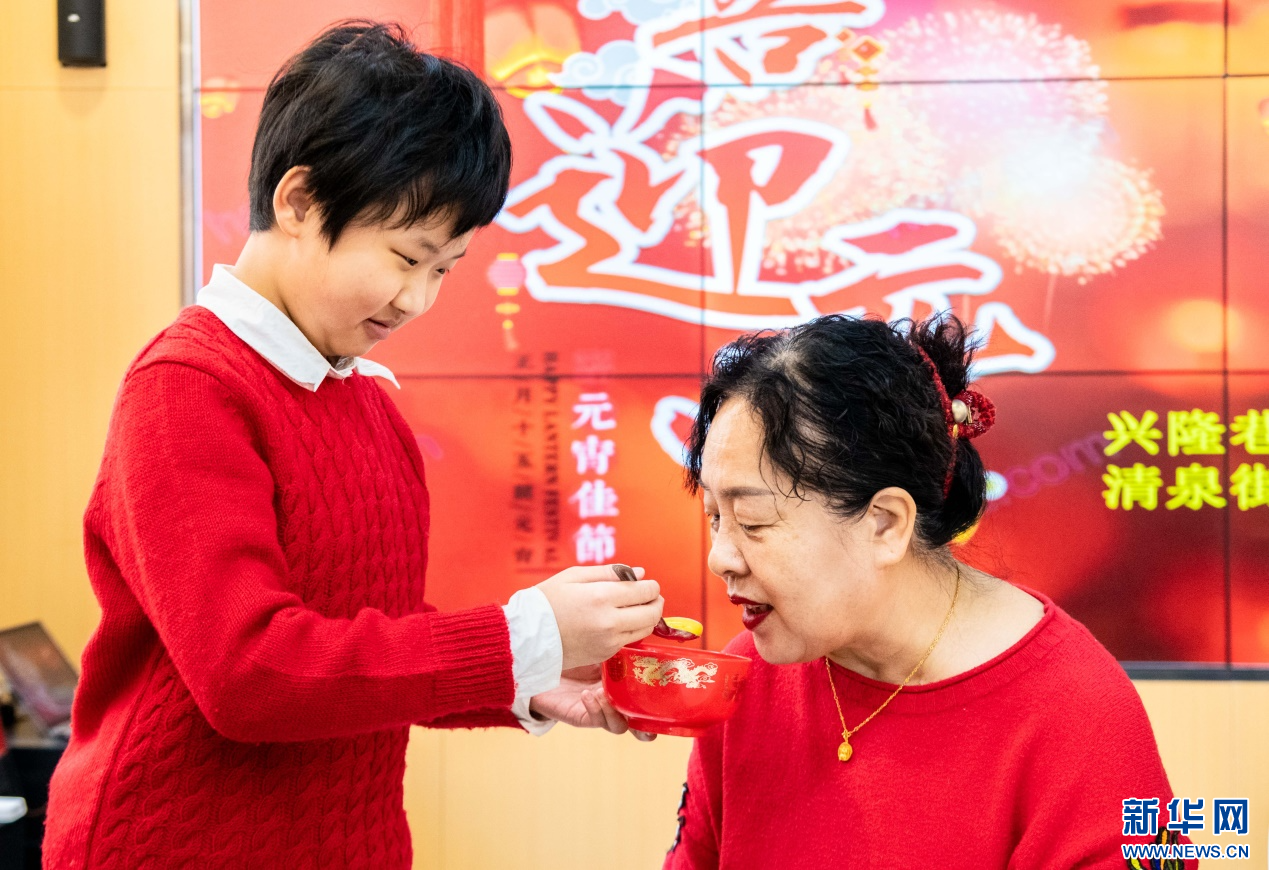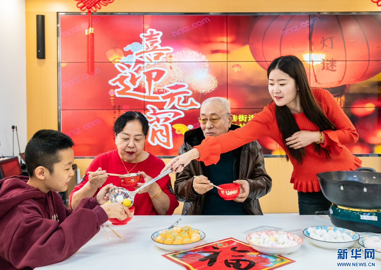 2月23日,社区居民在呼和浩特市玉泉区清泉街社区喜迎元宵节活动现场品尝元宵。新华网发(丁根厚 摄)