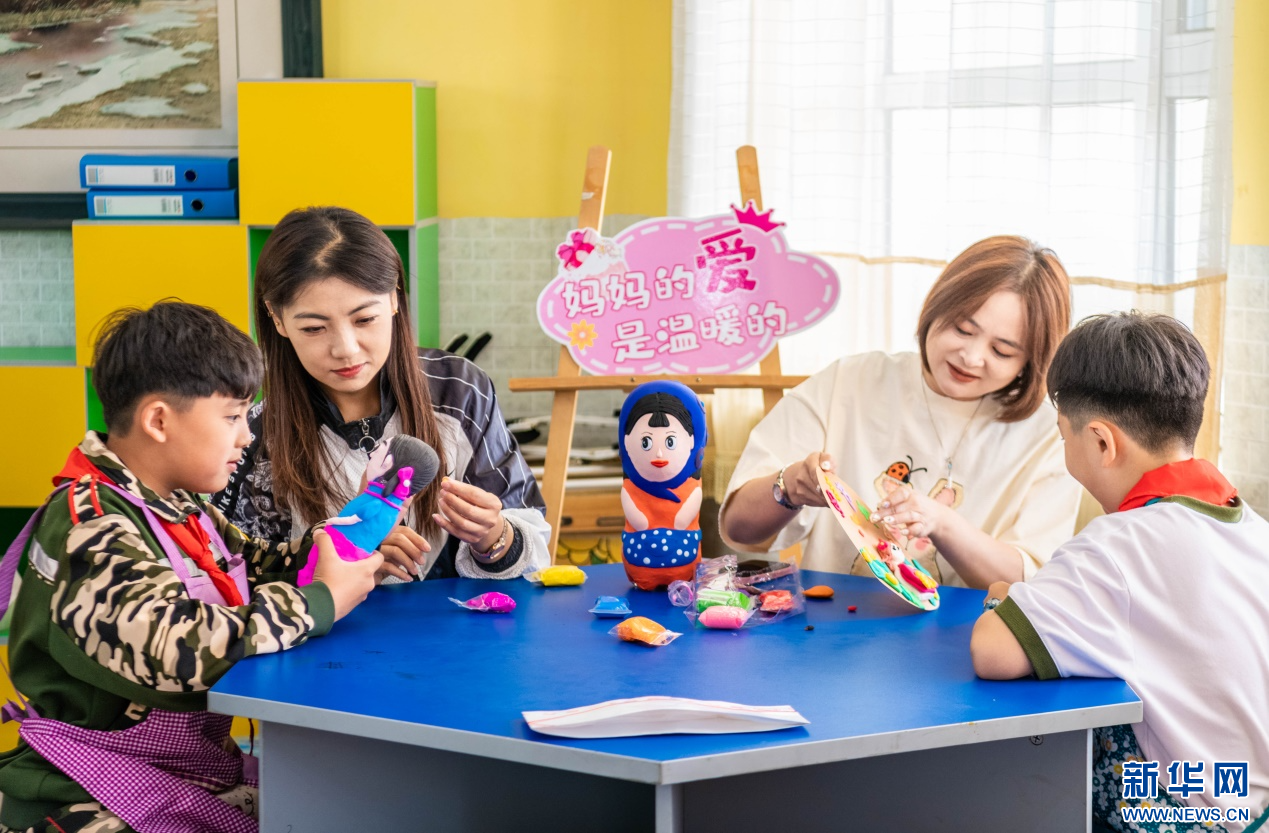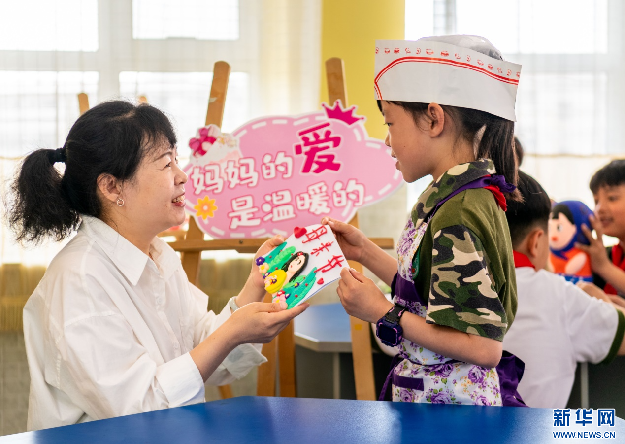 5月9日,呼和浩特市玉泉区五塔寺东街小学学生在为妈妈制作母亲节礼物。新华网发(丁根厚 摄)