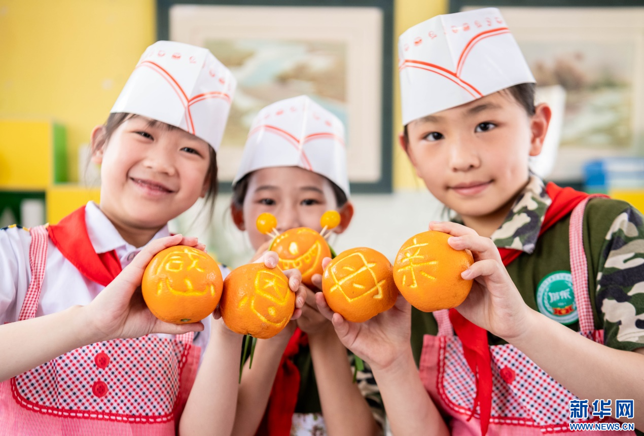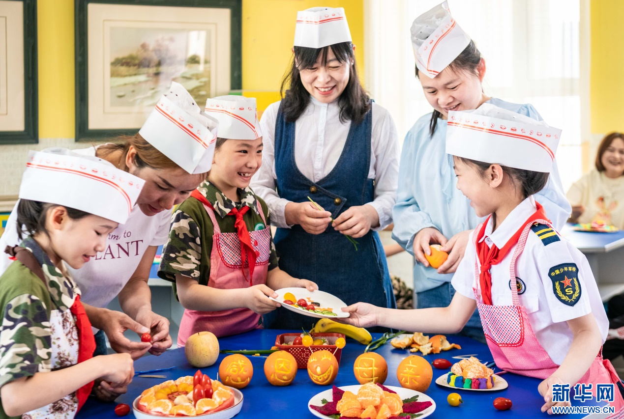 5月9日,呼和浩特市玉泉区五塔寺东街小学学生和妈妈一起制作水果拼盘。新华网发(丁根厚 摄)