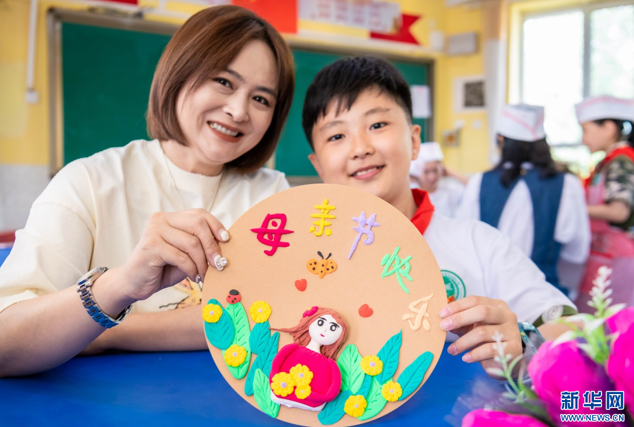 5月9日,呼和浩特市玉泉区五塔寺东街小学学生在和妈妈一起制作母亲节节日礼物。新华网发(丁根厚 摄)