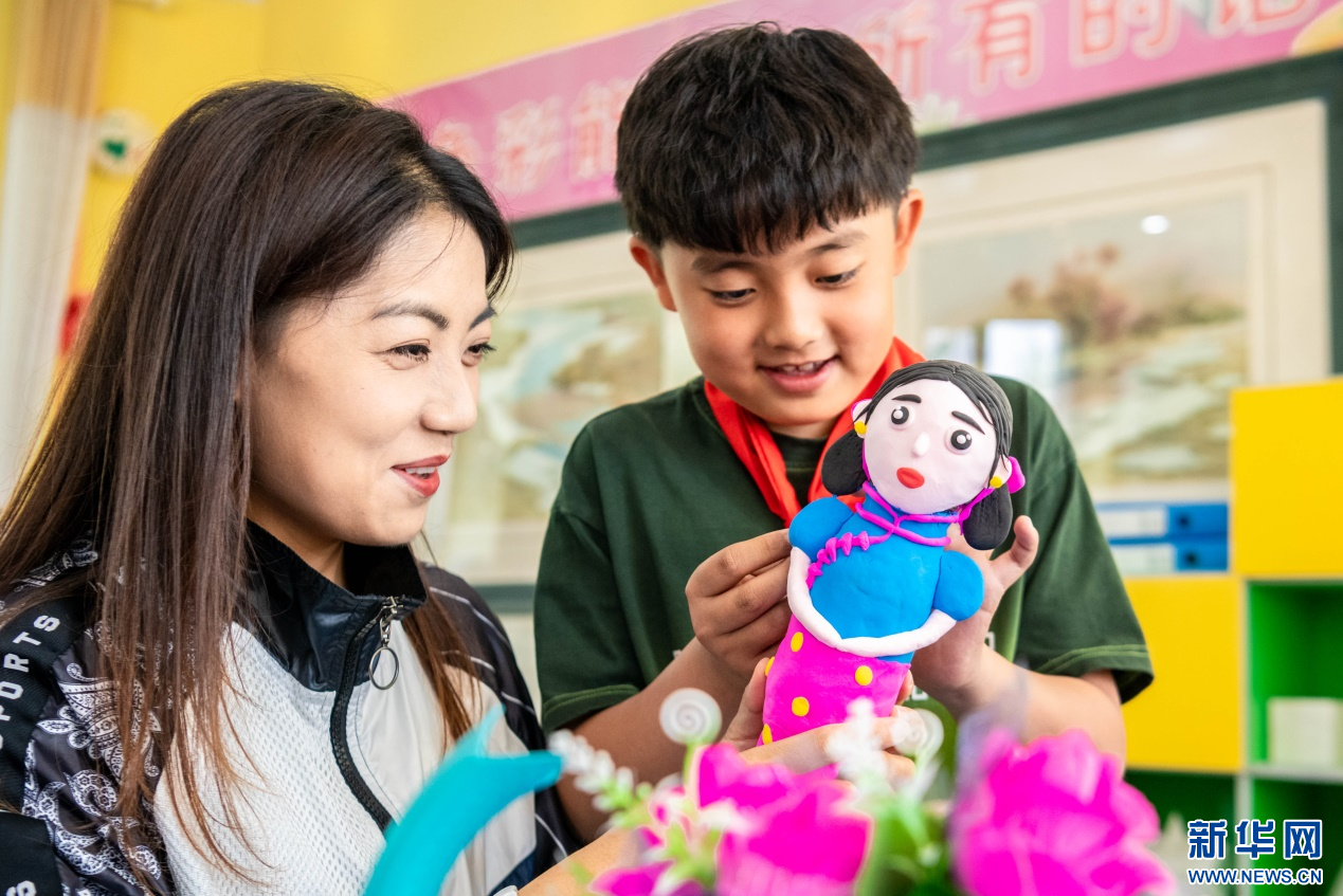 5月9日,呼和浩特市玉泉区五塔寺东街小学学生展示制作的以自己妈妈形象为主题的彩泥作品。新华网发(丁根厚 摄)
