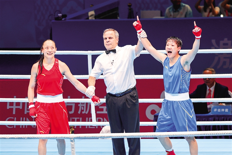 11月14日下午,深圳市宝安体育中心体育馆内掌声雷动、呐喊震天,第十五届全国运动会拳击项目上演巅峰对决。内蒙古小将赵轩敢打敢拼,以5比0的绝对优势击败巴黎奥运会冠军常园,将拳击女子54公斤级金牌稳稳收入囊中,上演了一场“青春逆袭”的精彩好戏。