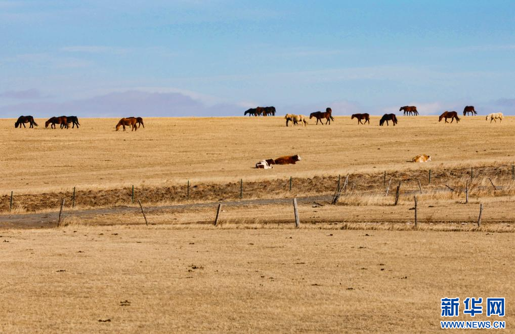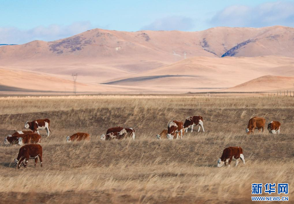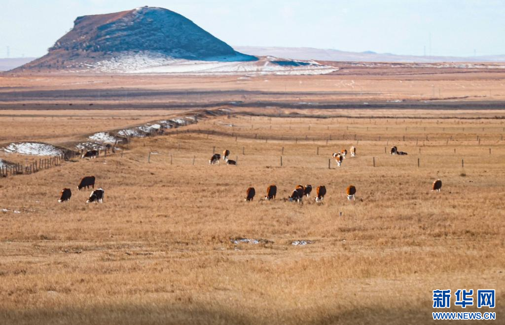 初冬时节,内蒙古自治区赤峰市克什克腾旗境内草原牧草秋黄,牲畜悠闲觅食,呈现一幅幅美丽的冬日画卷。(康文魁 摄影报道)