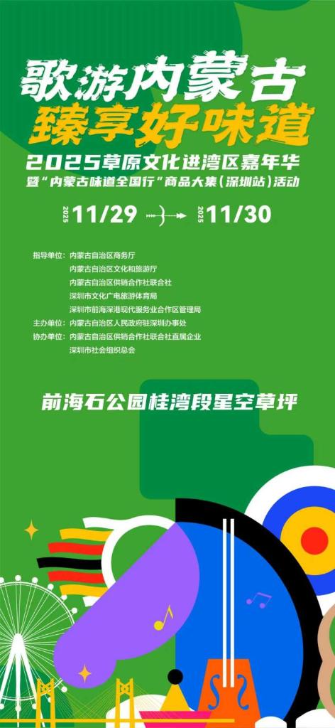 当马头琴的悠扬旋律在南海之滨响起,当草原的醇香奶茶与湾区市民的味蕾相遇,一场跨越三千公里的文化盛宴即将在深圳精彩上演。11月29日至30日,由内蒙古自治区人民政府驻深圳办事处主办,内蒙古自治区商务厅、内蒙古自治区文化和旅游厅、深圳市文化广电旅游体育局、前海深港现代服务业合作区管理局等共同指导的“歌游内蒙古 臻享好味道”——2025草原文化进湾区嘉年华暨“内蒙古味道全国行”商品大集将在前海石公园桂湾段星空草坪举行。