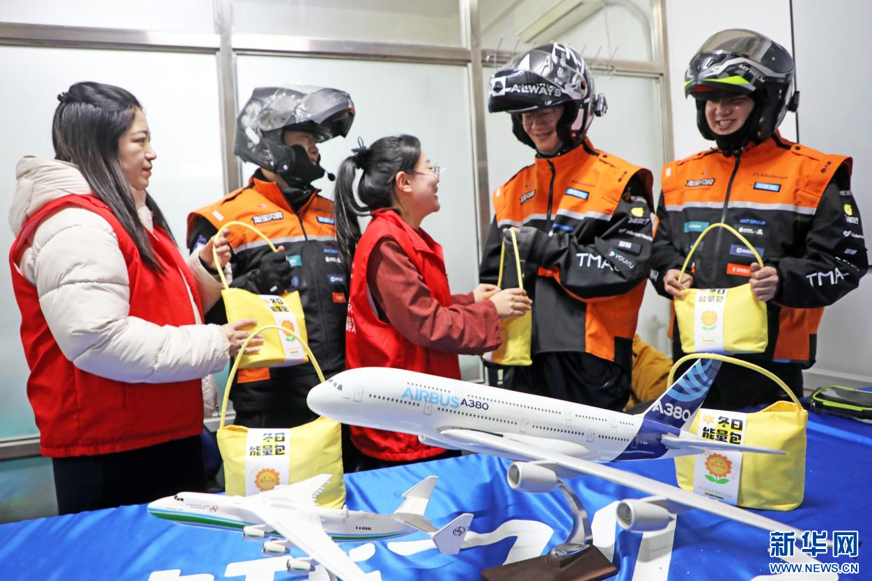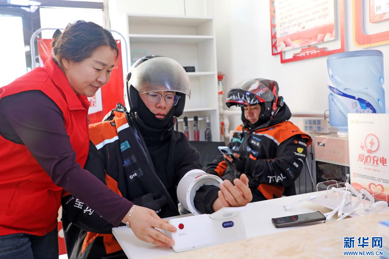 12月2日,在内蒙古自治区扎兰屯市繁荣街道光明社区淘宝闪购骑士驿站,志愿者为外卖骑手赠送“能量包”。新华网发(韩颖群 摄)