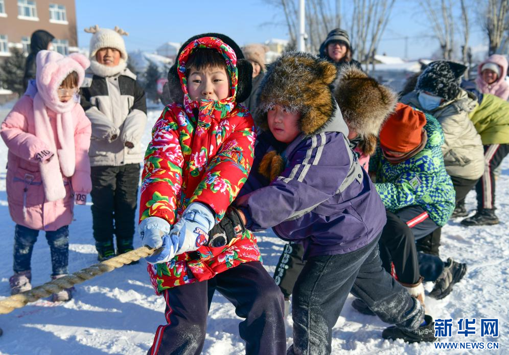 12月24日,呼伦贝尔额尔古纳市第三小学学生参加拔河赛。