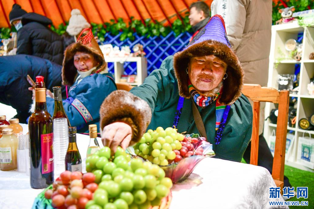 莫力达瓦达斡尔族自治旗——展销以莫力达瓦字体冰箱贴为代表的非遗文创,以及野生榛子、菇娘果汁、奶制品等农副产品,现场提供姜茶、奶茶并免费发放暖贴。