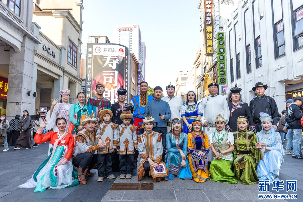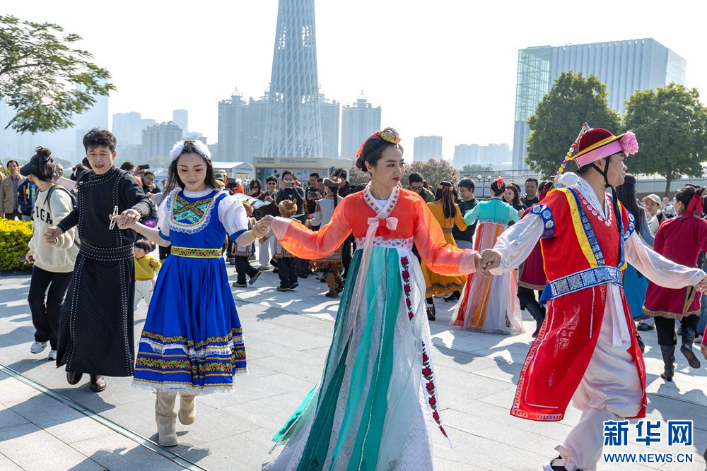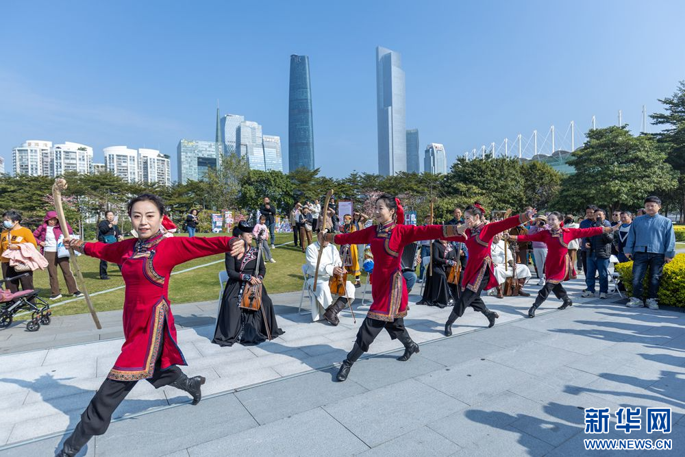 12月27日,内蒙古呼伦贝尔市乌兰牧骑队员在广州市街头进行文艺路演。新华网发