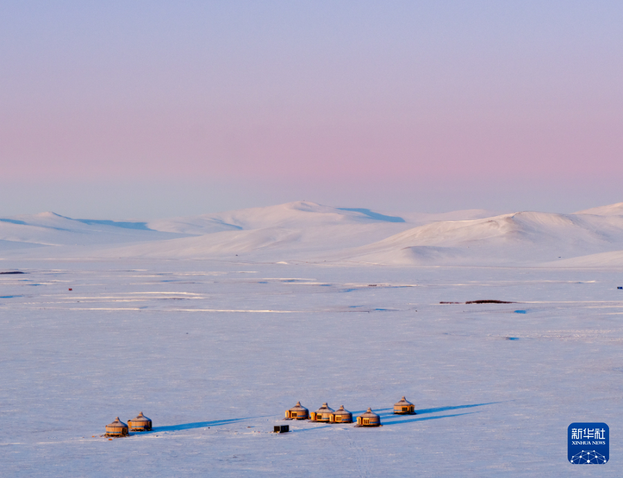 在内蒙古自治区呼伦贝尔市陈巴尔虎旗境内,莫尔格勒河蜿蜒曲折穿过雪原,蒙古包点缀其间,构成一幅宁静壮美的北国冬日画卷。 新华社记者 马金瑞 摄