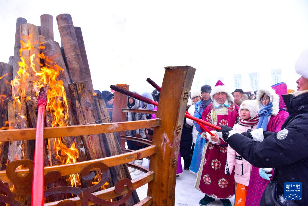 1月17日,人们在达里湖冬捕季活动现场的旺火前祈福。