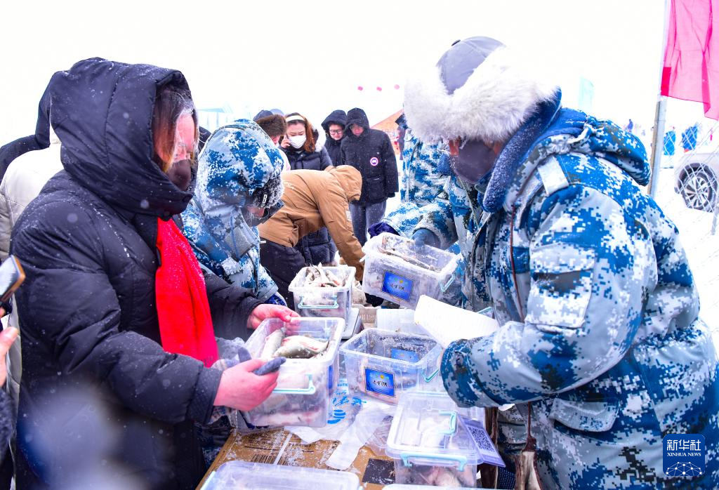 1月17日,人们在达里湖冬捕季活动现场购买刚出网的鱼。