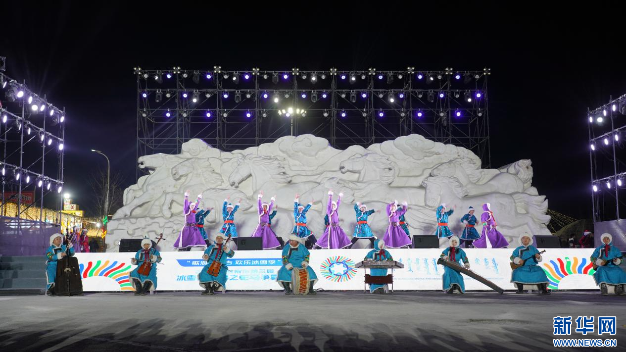 开幕式现场,以全场转圈舞展示草原儿女如火的热忱,璀璨烟花腾空而起,在冰雪夜空绽放出万千光影,将现场氛围推向高潮。烟花落幕,歌手倾情演唱、乐手现场奏响、舞蹈演员翩翩起舞,民俗协会服饰队、老干部服饰队、儿童服饰队等表演者手捧哈达助演。歌声悠扬、舞姿翩翩、哈达飘扬,将冰雪草原的壮阔与草原人民的热忱展现的淋漓尽致,现场气氛热闹非凡,寄托着广大草原儿女对新时代美好生活的深情礼赞。