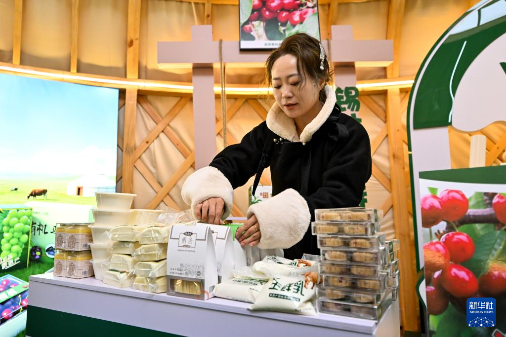 2月1日,在锡林郭勒那达慕风情园内,工作人员正在摆放奶食品。新华社记者 李志鹏 摄