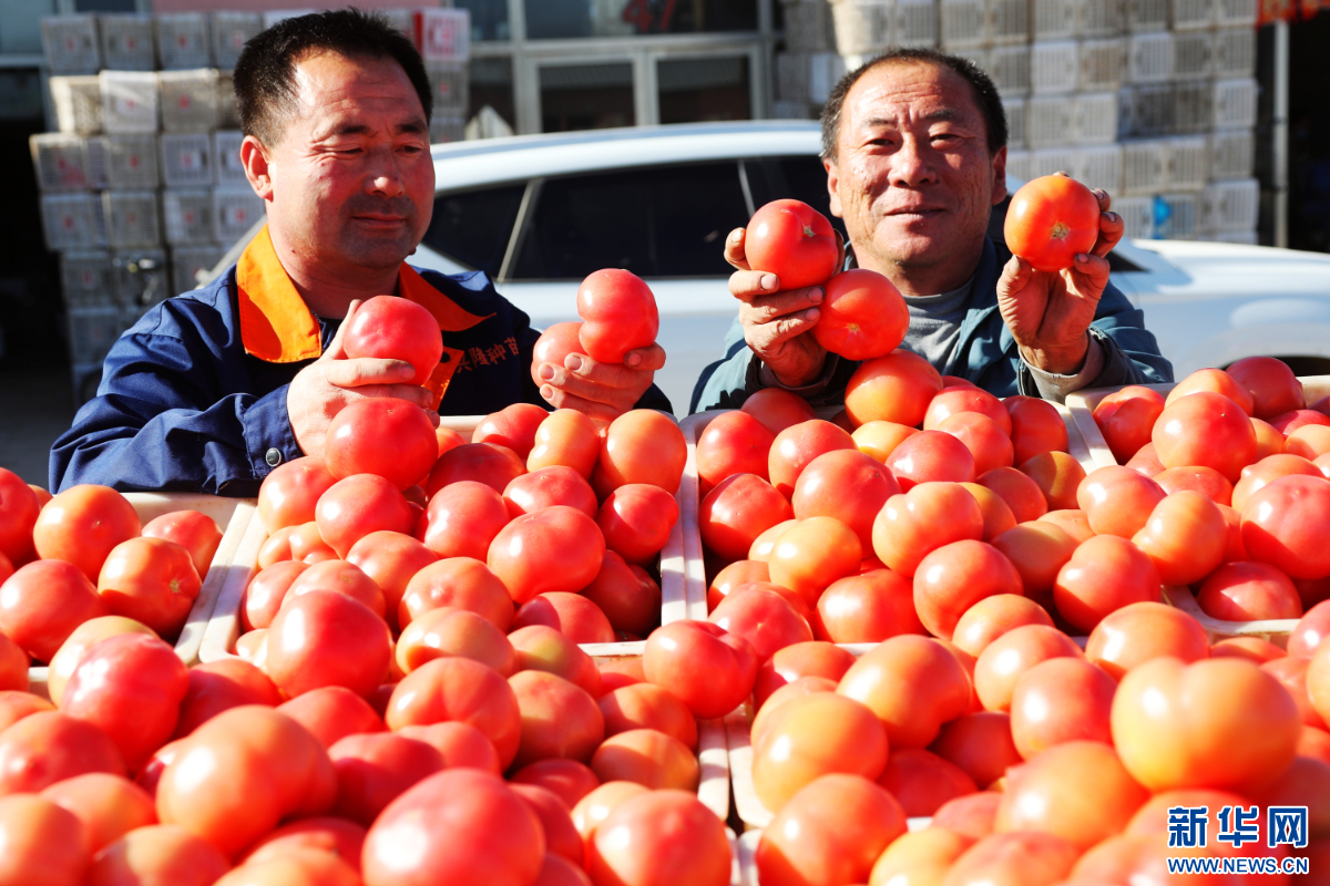 3月20日,内蒙古赤峰市松山区大庙镇公主岭现代农业产业园区内,农民正在进行番茄交易。新华网发(李富 摄)