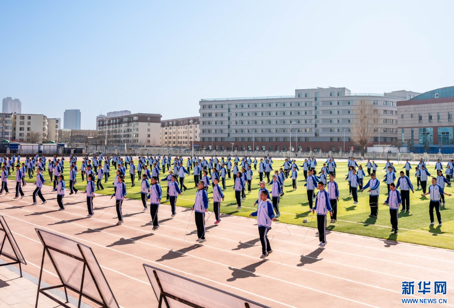 3月25日,中央民族大学附属中学呼和浩特分校学生在课间玩跳长绳。新华网发(丁根厚 摄)