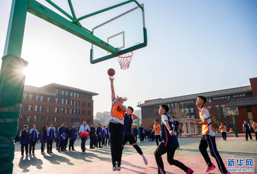3月25日,呼和浩特市第一中学学生正在上篮球课。新华网发(丁根厚 摄)