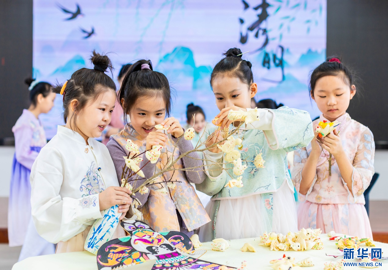 4月2日,在呼和浩特市玉泉区清泉街小学清明节主题活动现场,学生们将面塑“寒燕”悬挂枝头,寓意春燕归来。新华网发(丁根厚 摄)
